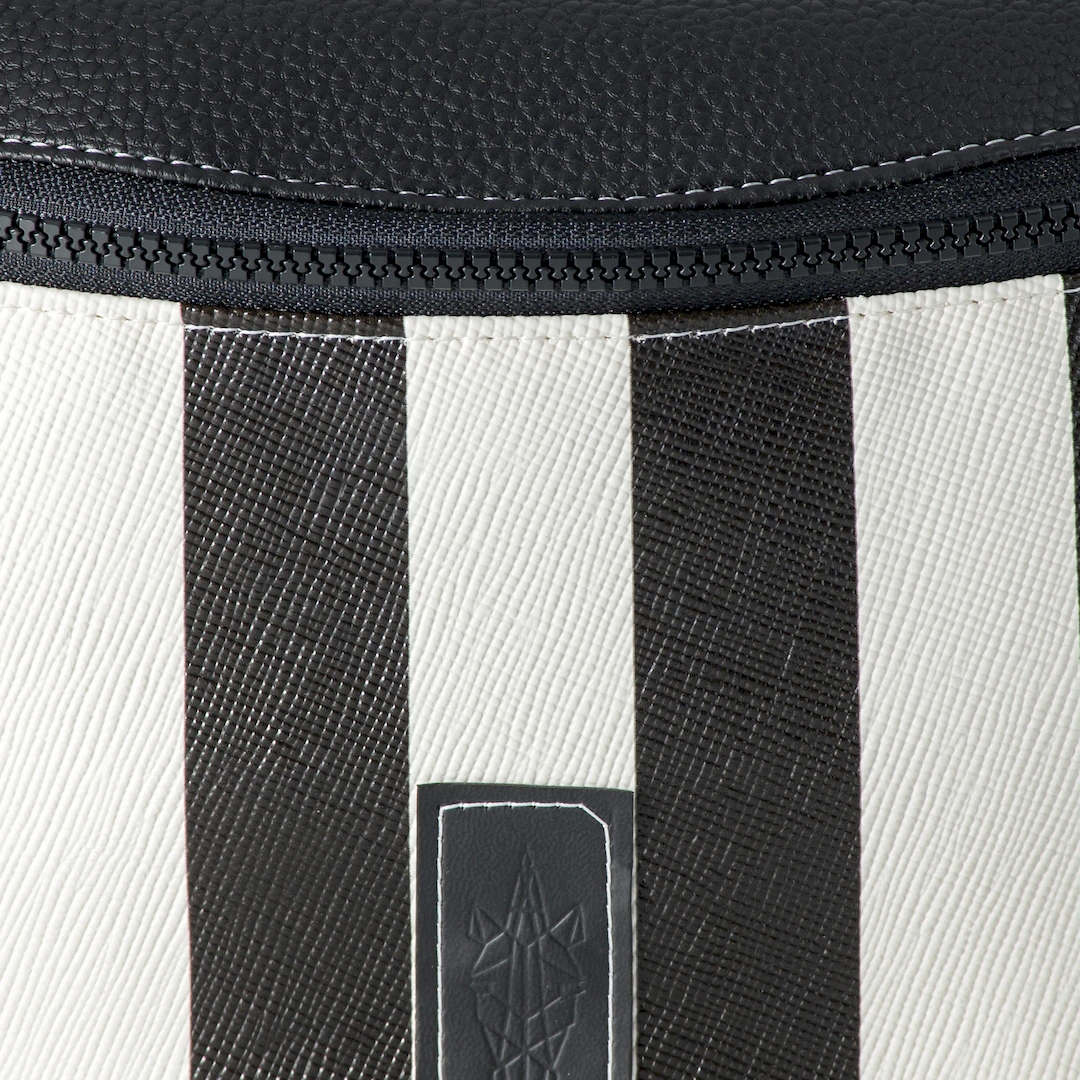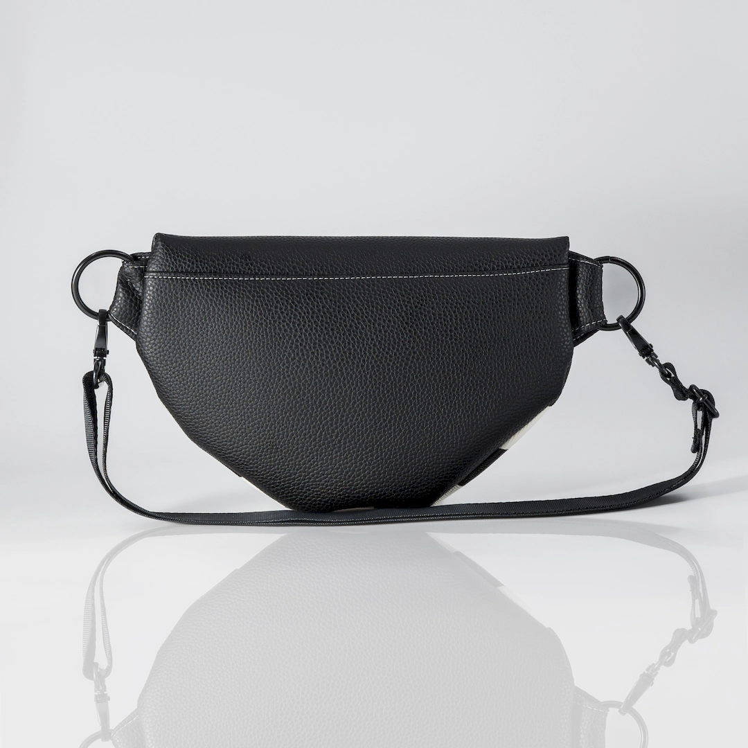 Τσάντα μπανάνα κατασκευασμένη από 2 υλικά : ματ δερματίνη σε μαύρο χρώμα και πλαστικοποιημένη δερματίνη με τύπωμα ρίγες σε άσπρο και μαύρο χρώμα. Η Alcatraz Small Banana Bag εσωτερικά έχει 2 τσέπες και μαύρη φόδρα. Διαθέτει μαύρο ιμάντα φάρδους 4 εκ. που διαθέτει αυξομείωση και είναι αποσπώμενος. Το μικρό μέγεθος έχει 32 εκ. φερμουάρ με 20 εκ. ύψος. Όλα μας τα προϊόντα κατασκευάζονται στο ατελιέ μας στη Θεσσαλονίκη, δίνοντας έμφαση στη λεπτομέρεια και με σεβασμό προς τον πελάτη και το περιβάλλον.