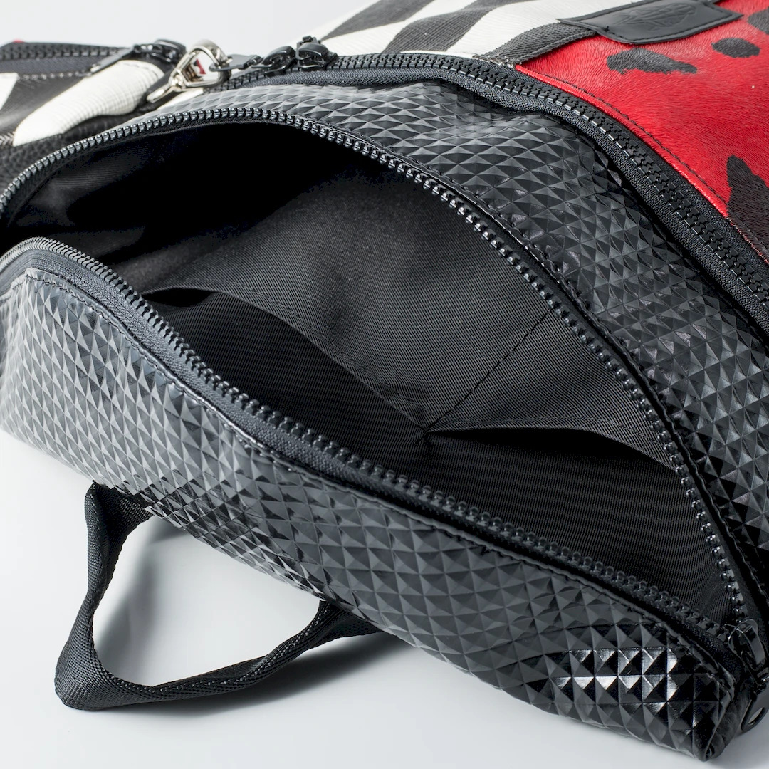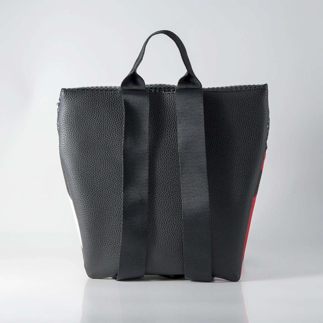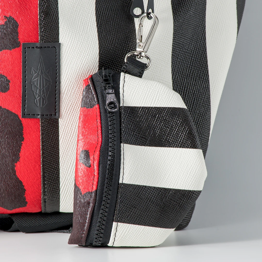 Σακίδιο κατασκευασμένο από 4 υλικά: ματ δερματίνη σε μαύρο χρώμα, μαύρη λουστρίνι δερματίνη με ανάγλυφο τρισδιάστατο εφέ κύβου, ματ δερματίνη με κόκκινο και μαύρο cow print και πλαστικοποιημένη δερματίνη με τύπωμα ρίγες σε άσπρο και μαύρο χρώμα. Το Black Forest Backpack εσωτερικά έχει μαύρη φόδρα, 2 τσέπες και η κεντρική θήκη κλείνει με φερμουάρ. Εξωτερικά έχει άλλη μία τσέπη με φερμουάρ. Οι ιμάντες είναι με αυξομείωση και το μπανανάκι είναι αποσπώμενο. Όλα μας τα προϊόντα κατασκευάζονται στο ατελιέ μας στη Θεσσαλονίκη, δίνοντας έμφαση στη λεπτομέρεια και με σεβασμό προς τον πελάτη και το περιβάλλον.