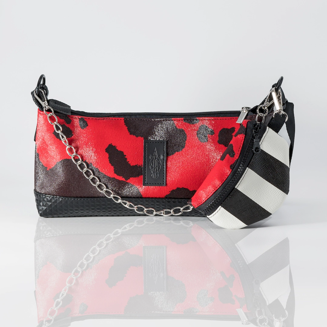 Μπρελόκ σε σχήμα τσάντας μπανάνα κατασκευασμένo από τρία υλικά: ματ δερματίνη με κόκκινο και μαύρο cow print, πλαστικοποιημένη δερματίνη με τύπωμα ρίγες σε άσπρο και μαύρο χρώμα και ματ δερματίνη σε μαύρο χρώμα. Το Black Forest Charm Banana Bag είναι αποσπώμενο και μπορεί να κρεμαστεί οπουδήποτε. Χωράει, κέρματα, χαρτονομίσματα, χρεωστική/πιστωτική κάρτα, ακουστικά, κλειδιά κτλ. Διαθέτει μεταλλικό κλιπ και μπορεί να κρεμαστεί. Το μπανανάκι έχει 15 εκ. φερμουάρ με 10 εκ. ύψος. Όλα μας τα προϊόντα κατασκευάζονται στο ατελιέ μας στη Θεσσαλονίκη, δίνοντας έμφαση στη λεπτομέρεια και με σεβασμό προς τον πελάτη και το περιβάλλον. Στην κατηγορία https://katiangeli.com/accessories/charm-banana-bags/ μπορείτε να βρείτε και άλλα σχέδια.