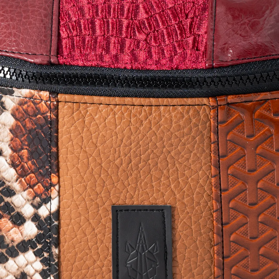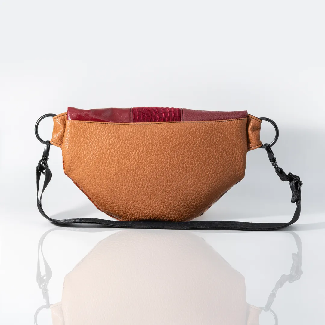 Τσάντα μπανάνα κατασκευασμένη από 5 υλικά : ματ δερματίνη με snake print σε άσπρη, μαύρη και καφέ απόχρωση, λουστρίνι δερματίνη με ανάγλυφο τύπωμα σε καφέ χρώμα, υλικό με βελούδινη υφή (κατάλληλο για την κατασκευή τσαντών) σε μπορντώ χρώμα με ανάγλυφη υφή κροκό, ματ δερματίνη με ελαφριά γυαλάδα σε μπορντώ χρώμα και δερματίνη ματ σε καφέ και μπορντώ χρώμα. Η Brown Brick Small Banana Bag εσωτερικά έχει 2 τσέπες και μαύρη φόδρα. Διαθέτει μαύρο ιμάντα φάρδους 4 εκ. που διαθέτει αυξομείωση και είναι αποσπώμενος. Το μικρό μέγεθος έχει 32 εκ. φερμουάρ με 20 εκ. ύψος. Όλα μας τα προϊόντα κατασκευάζονται στο ατελιέ μας στη Θεσσαλονίκη, δίνοντας έμφαση στη λεπτομέρεια και με σεβασμό προς τον πελάτη και το περιβάλλον.