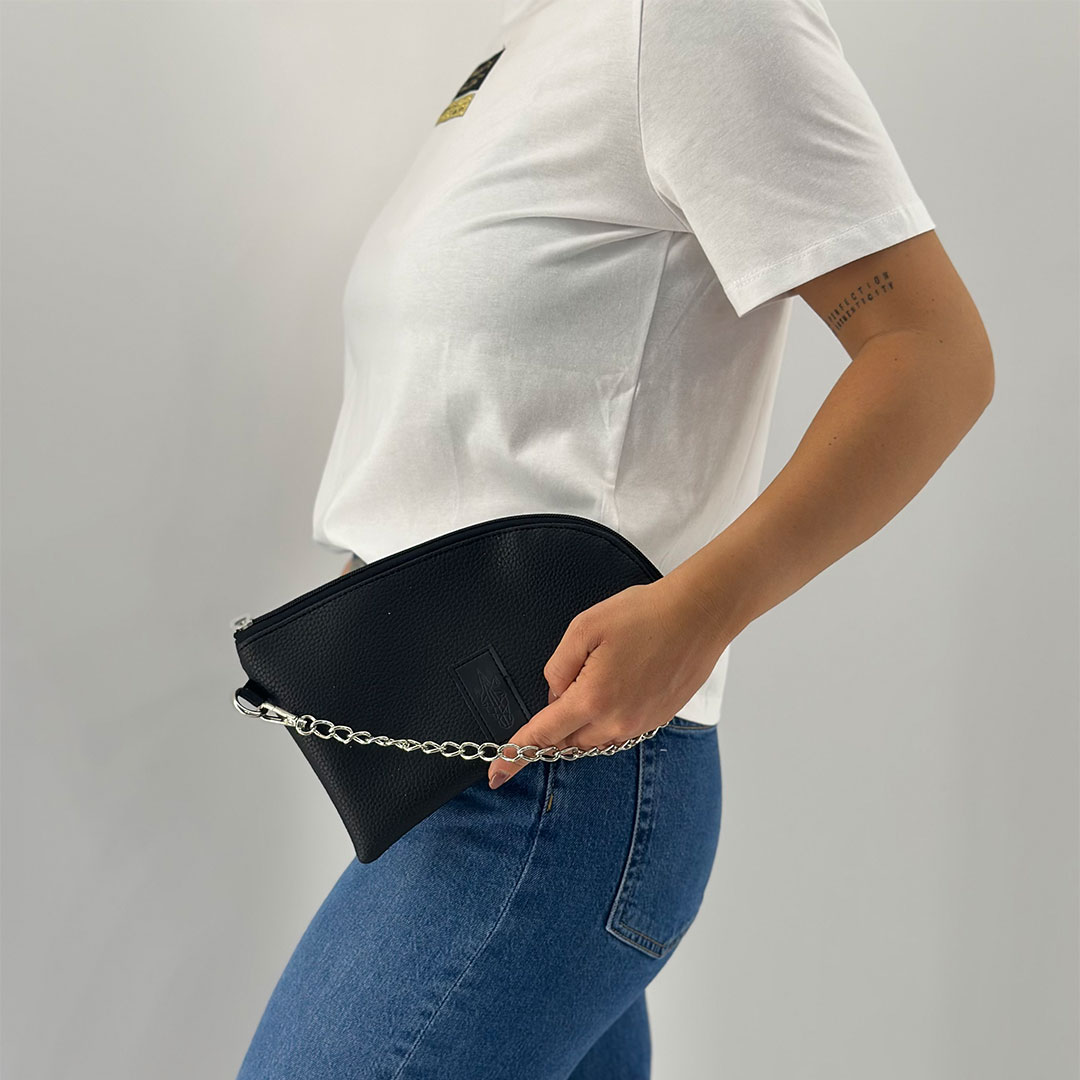 Φάκελος κατασκευασμένος από δερματίνη ματ σε μαύρο χρώμα. Κλείνει με φερμουάρ και εσωτερικά έχει μαύρη φόδρα. Το Classic Pouch είναι κατασκευασμένο για να φοριέται χιαστί με τον ιμάντα του, αλλά μπορεί να κρατηθεί και ως φάκελος σκέτος αφού ο ιμάντας μπορεί να αφαιρεθεί και να χρησιμοποιηθεί η διακοσμητική του αλυσίδα ως λαβή. Διαθέτει μαύρο ιμάντα φάρδους 1,5 εκ. με αυξομείωση και αλυσίδα, που και τα δύο είναι αποσπώμενα. Έχει 26 εκ. μήκος με 16 εκ. ύψος και χωράει με άνεση κινητό, κλειδιά, καπνοθήκη ή iqos και ένα μικρό πορτοφόλι. Όλα μας τα προϊόντα κατασκευάζονται στο ατελιέ μας στη Θεσσαλονίκη, με έμφαση στη λεπτομέρεια και σεβασμό στον πελάτη και στο περιβάλλον.