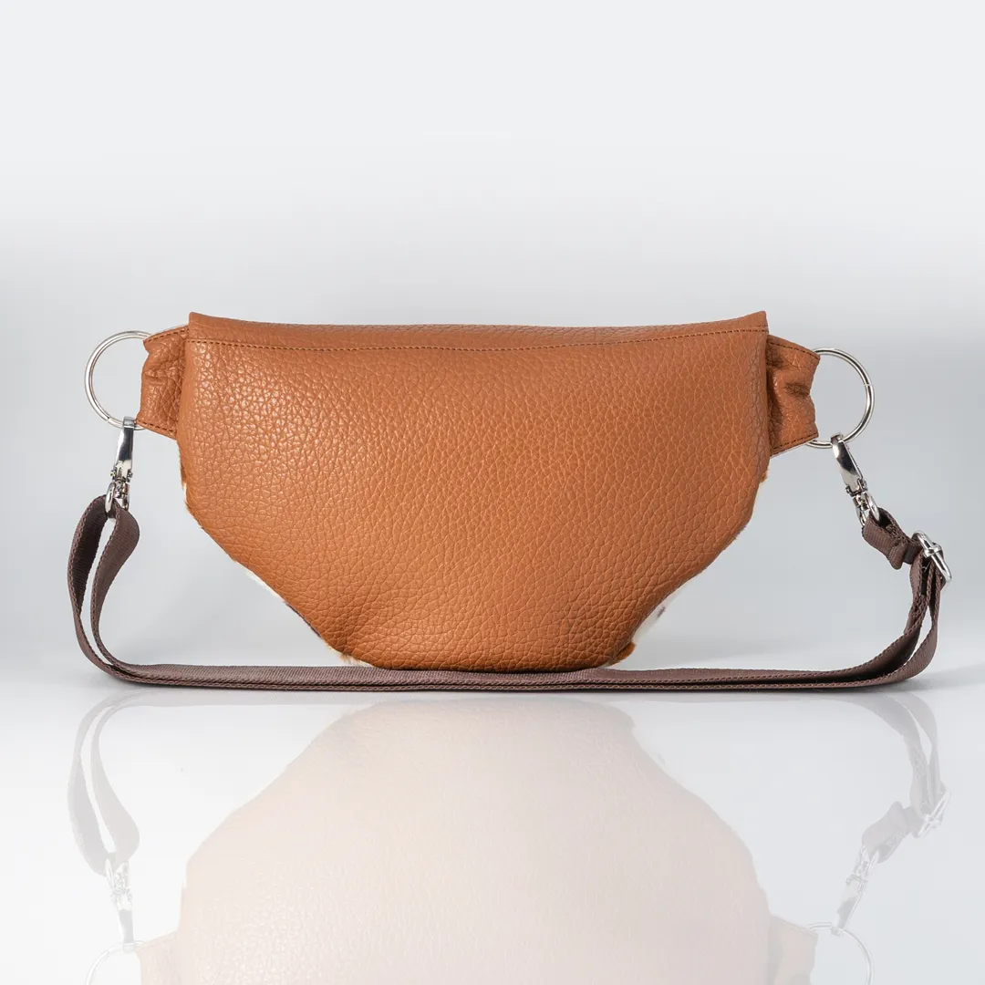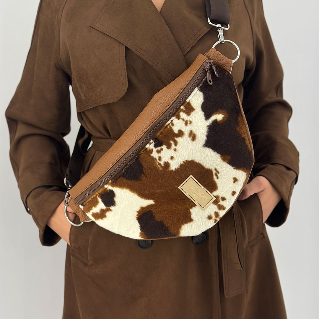 Τσάντα μπανάνα κατασκευασμένη από 2 υλικά : δερματίνη ματ σε καφέ χρώμα και συνθετικό υλικό τύπου με εφέ pony skin με cow print. Η Cow Lover Large Banana Bag εσωτερικά έχει 2 τσέπες και μπεζ φόδρα. Διαθέτει καφέ ιμάντα φάρδους 4 εκ. που διαθέτει αυξομείωση και είναι αποσπώμενος. Το μεγάλο μέγεθος έχει 40 εκ. φερμουάρ με 24 εκ. ύψος. Όλα μας τα προϊόντα κατασκευάζονται στο ατελιέ μας στη Θεσσαλονίκη, δίνοντας έμφαση στη λεπτομέρεια και με σεβασμό προς τον πελάτη και το περιβάλλον.