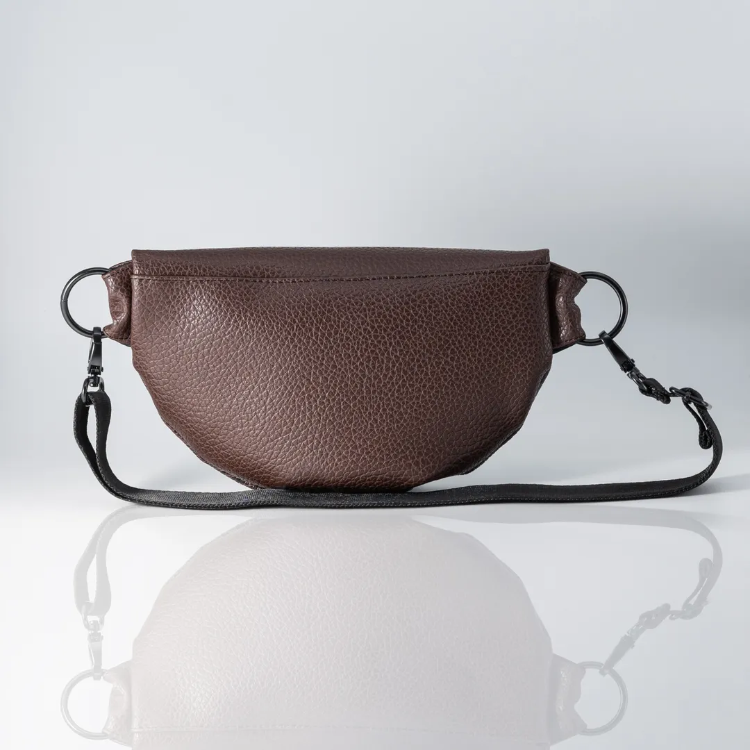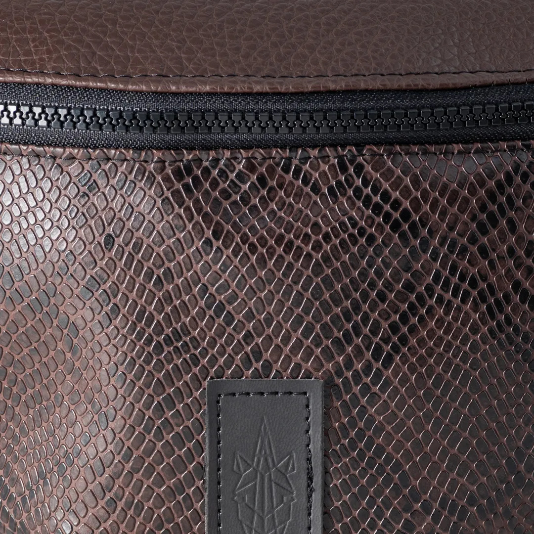 Τσάντα μπανάνα κατασκευασμένη από 2 υλικά : καφέ δερματίνη με εφέ φιδιού και καφέ ματ δερματίνη. Η Dark Chocolate Large Banana Bag εσωτερικά έχει 2 τσέπες και μαύρη φόδρα. Διαθέτει μαύρο ιμάντα φάρδους 4 εκ. που διαθέτει αυξομείωση και είναι αποσπώμενος. Το μεγάλο μέγεθος έχει 40 εκ. φερμουάρ με 24 εκ. ύψος. Όλα μας τα προϊόντα κατασκευάζονται στο ατελιέ μας στη Θεσσαλονίκη, δίνοντας έμφαση στη λεπτομέρεια και με σεβασμό προς τον πελάτη και το περιβάλλον.