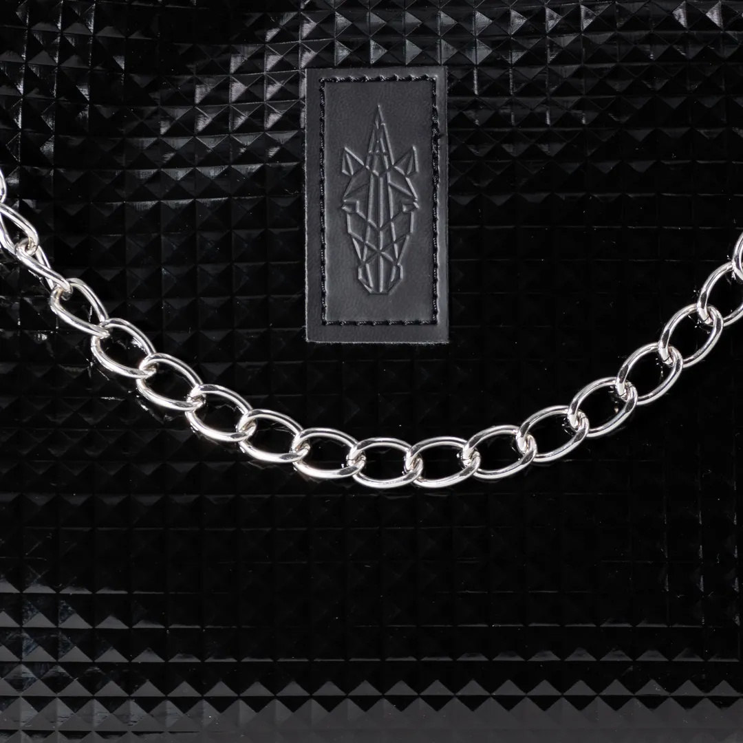 Shoulder bag made of black patent leatherette with an embossed 3D cube effect. The 3D New Baguette Bag has two internal pockets, black lining and a zipper closure. It has a 3 cm wide black strap. which is adjustable and detachable, and the bag can be worn both crossbody and on the shoulder. It also has a 0.4 cm long chain that is suitable for wearing on the shoulder but can also be used for decorative purposes. This baguette bag measures 20 cm in height, 30 cm in length, and 7 cm in width at the base. All our products are made in our Thessaloniki atelier, with a focus on detail and respect for our customers and the environment.
