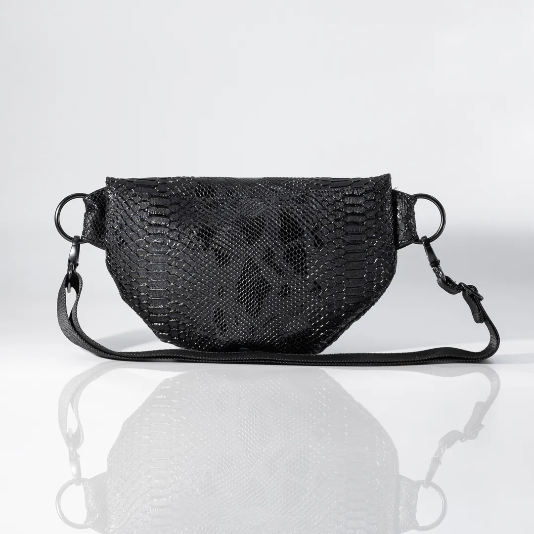 Banana bag made of 2 materials: black leatherette with embossed snake effect and leatherette with black and white zebra pattern. The Black Zebra Small Banana Bag has two pockets inside and a black lining. It has a black strap, 4 cm wide, which is adjustable and detachable. Small size: 32 cm. 20 cm zipper. height. All our products are handmade in our Thessaloniki atelier, with attention to detail and respect for our customers and the environment.