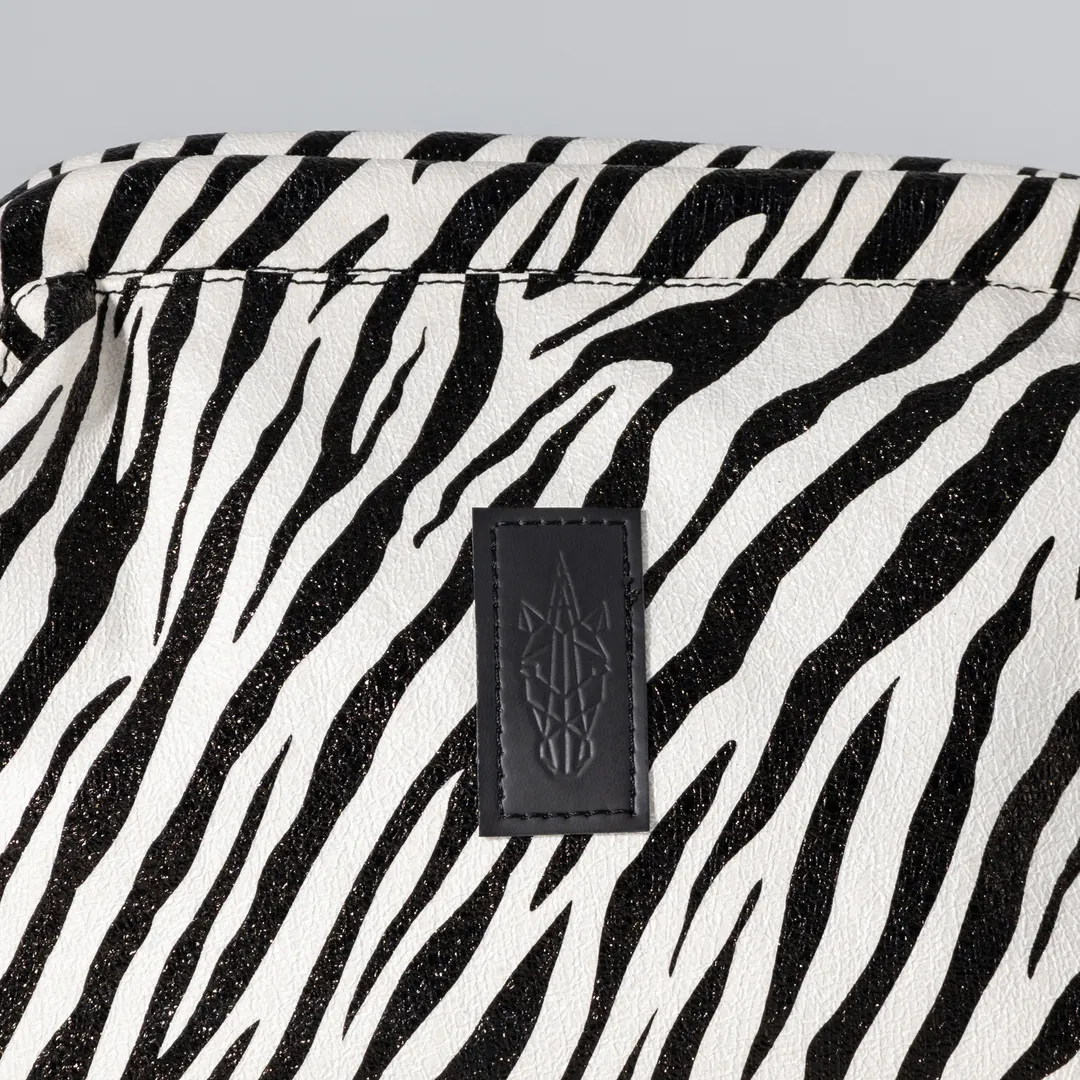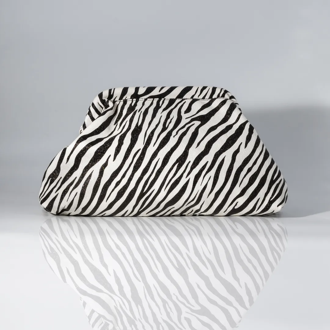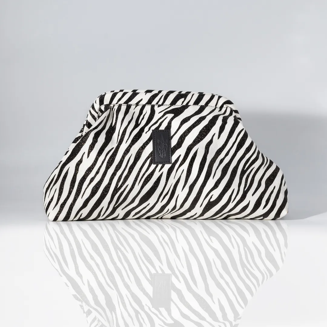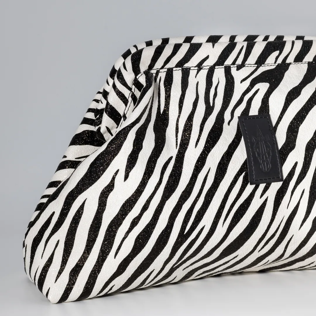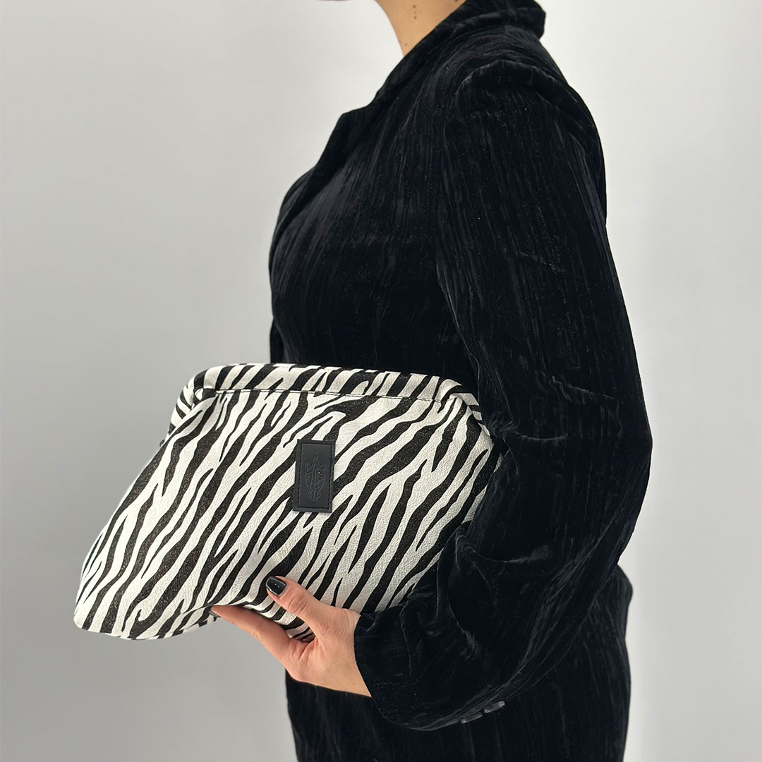 The Classic Zebra Metallic Clutch is a medium-sized bag that closes with a metallic clasp integrated into its seams. It’s crafted from matte faux leather with a black and white zebra print. It has a black lining inside. All our products are made in our Thessaloniki atelier, with a focus on detail and respect for our customers and the environment.