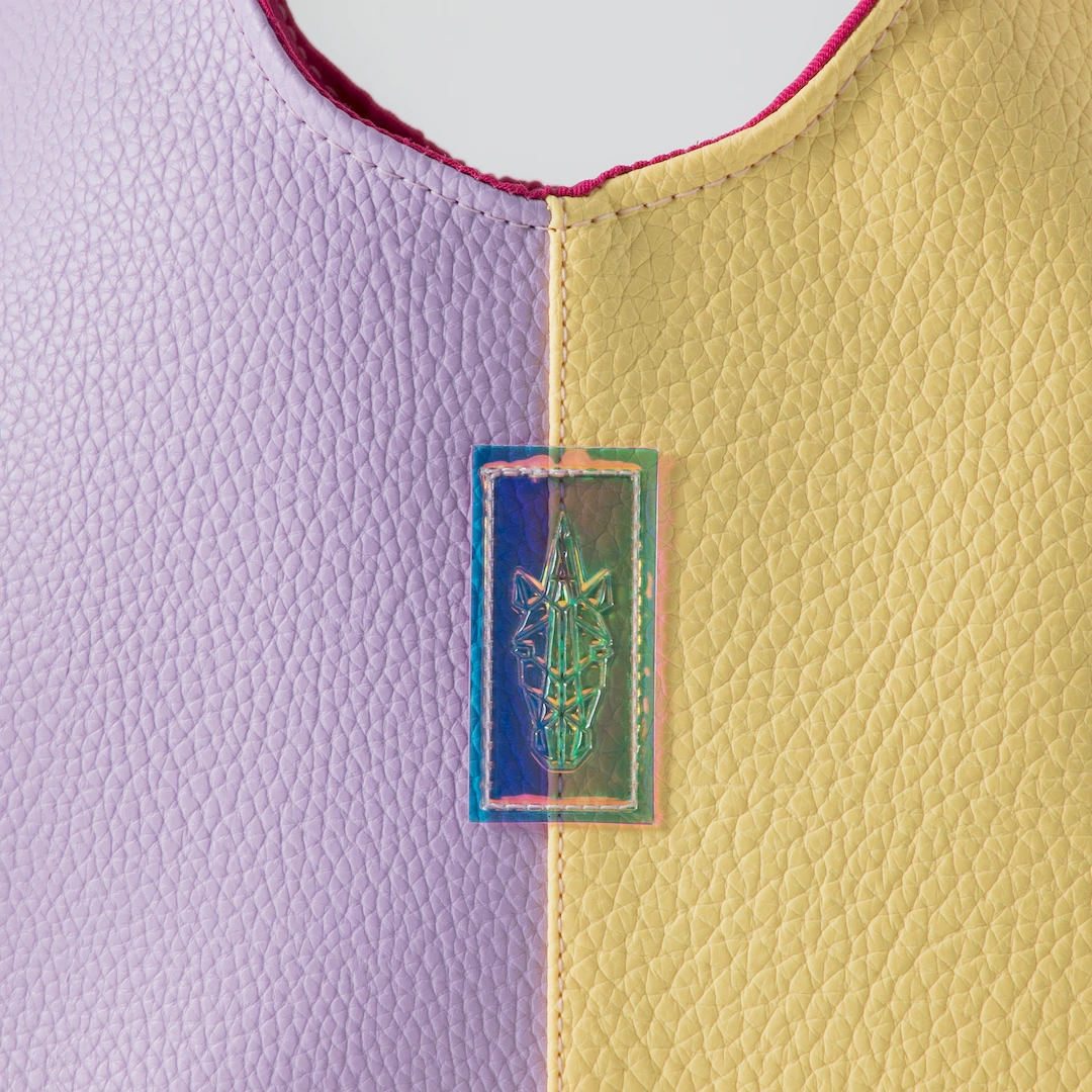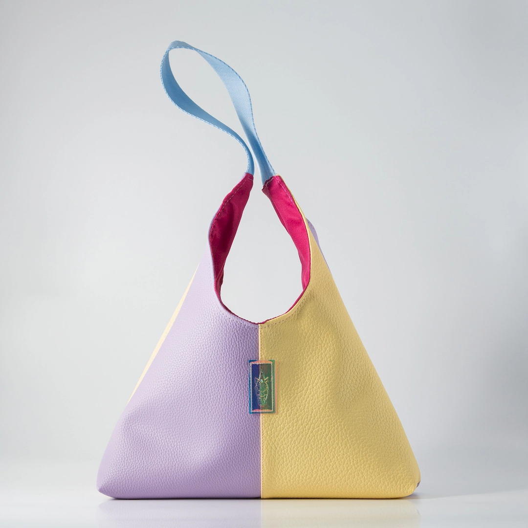 Shoulder bag made from matte faux leather in lilac and baby yellow colors. The Cupcake Triangle Shopper has a fuchsia lining and is designed to be worn on the shoulder. This bag has a base width of 6 cm, a width of 40 cm, and a usable height of 22 cm, while its total height (including the strap) is 58 cm. All our products are handmade in our Thessaloniki workshop, with attention to detail and respect for the customer and the environment. You can find more designs in the category https://katiangeli.com/large-bags/triangle-shoppers/.