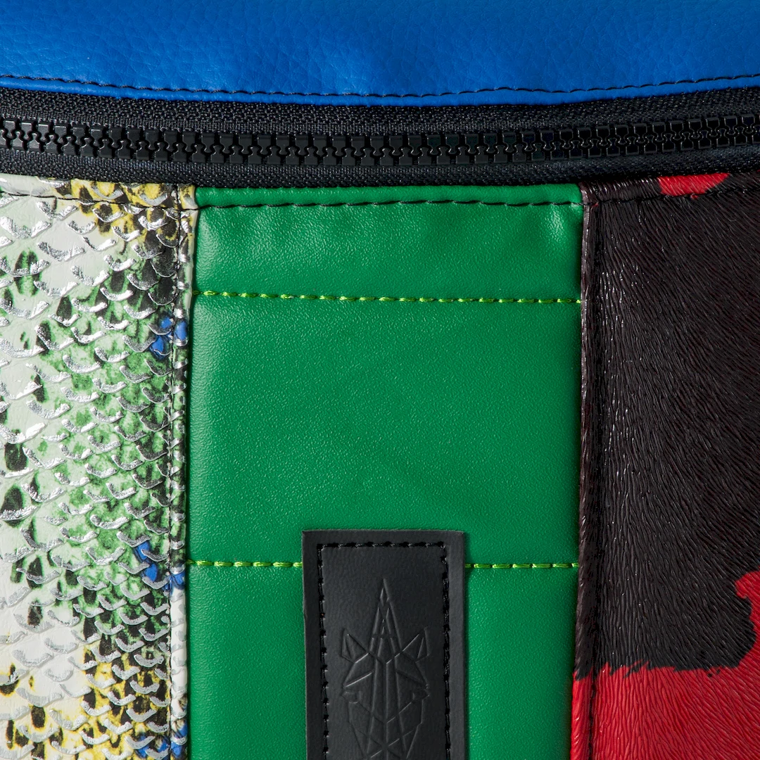 A banana bag made from 4 materials: colorful patterned faux leather with an embossed snake effect, matte faux leather with red and black cow print, quilted matte faux leather in green, and electric blue matte faux leather. The Exotic Large Banana Bag has 2 internal pockets and a black lining. It has a black strap, 4 cm wide, which is adjustable and detachable. The large size has a 40 cm zipper with a 24 cm height. All our products are handmade in our Thessaloniki atelier, with attention to detail and respect for our customers and the environment. In the category https://katiangeli.com/banana-bags/large-banana-bags/, you can find other designs.