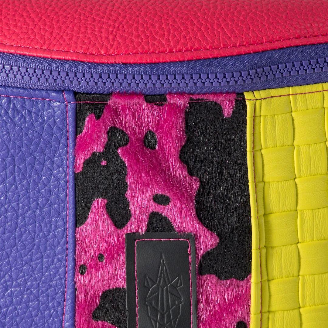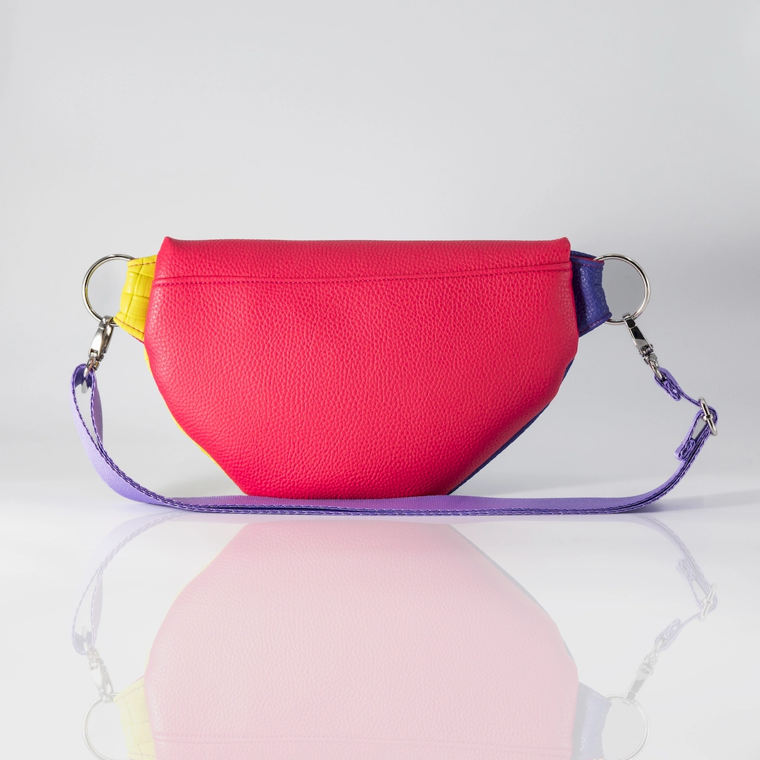 A banana bag made from 3 materials: matte faux leather in purple and fuchsia, synthetic pony skin-type material with fuchsia and black cow print, and matte faux leather with a straw effect in lime. The Haribo Large Banana Bag has 2 internal pockets and a fuchsia lining. It has a fuchsia strap, 4 cm wide. which is adjustable and detachable. The large size has a 40 cm zipper with a 24 cm height. All our products are handmade in our Thessaloniki atelier, with attention to detail and respect for our customers and the environment. In the category https://katiangeli.com/banana-bags/large-banana-bags/, you can find other designs.
