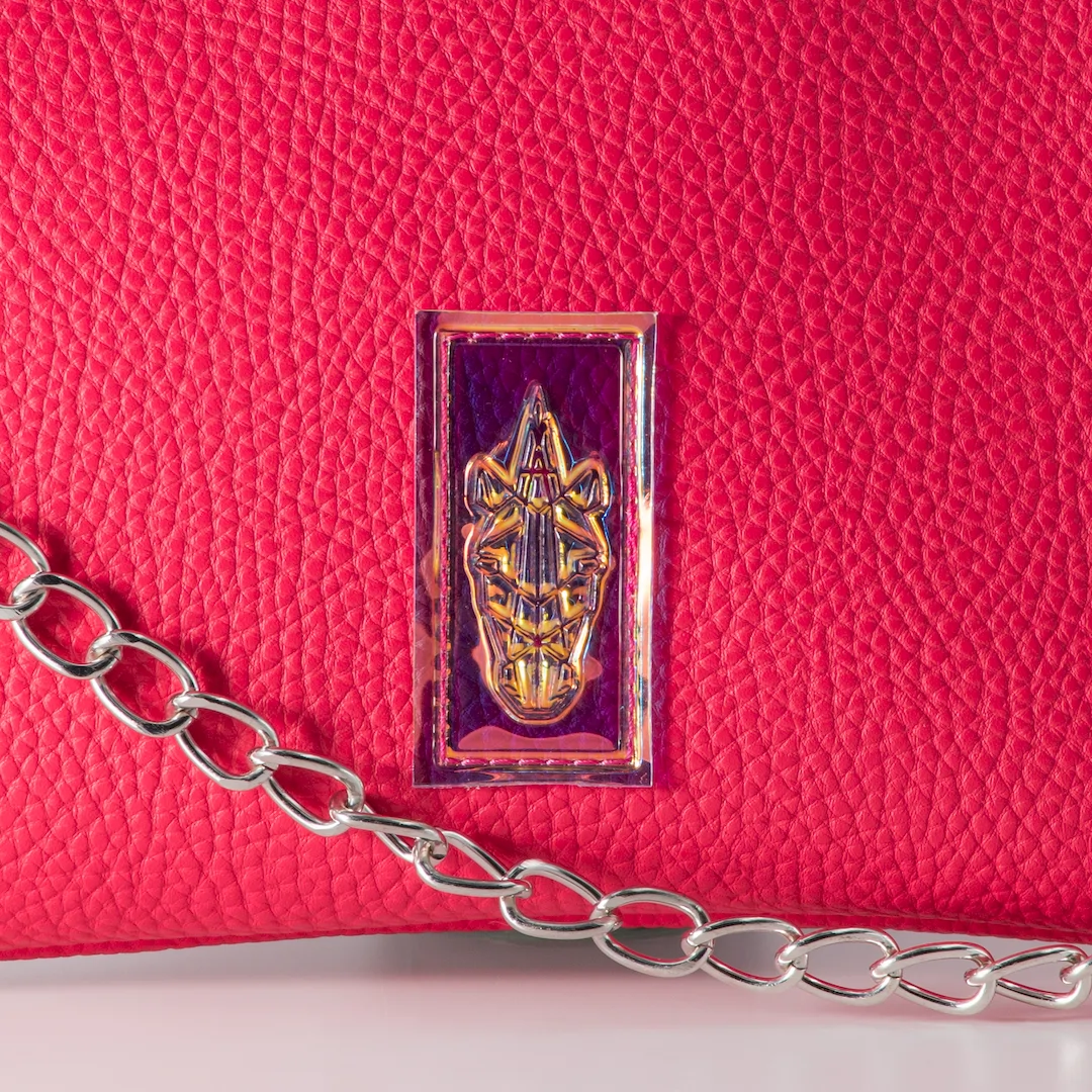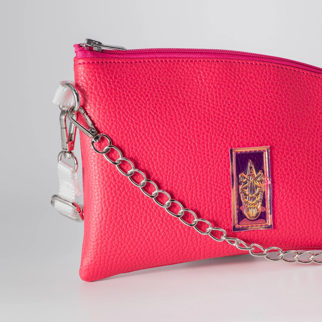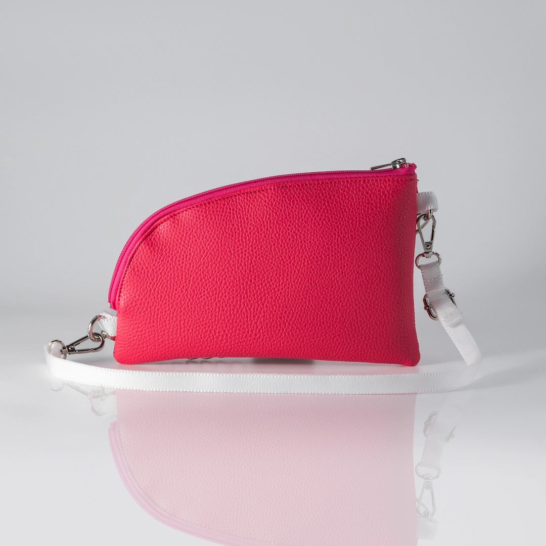 Pouch made from matte faux leather in fuchsia. It closes with a zipper and has a fuchsia lining on the inside. The Haribo Pouch is designed to be worn crossbody with its strap, but you can also carry it as a clutch on its own, as the strap is removable and its decorative chain can be used as a handle. It features a white 1.5 cm wide strap. It features an adjustable and detachable strap, plus a removable chain. It measures 26 cm long by 16 cm high, comfortably fitting your phone, keys, tobacco pouch or IQOS, and a small wallet. All our products are made in our atelier in Thessaloniki, with attention to detail and respect for our customers and the environment. You can find more designs in the https://katiangeli.com/pouches/ category.