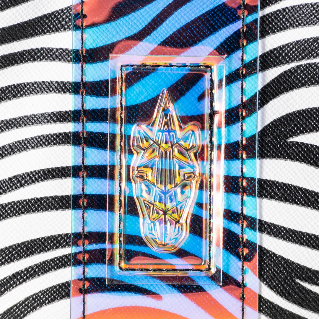 Wallet made of 2 materials: laminated leatherette with a black and white zebra pattern and holographic PVC transparency with the colors of the iris. It closes with a zipper and has 2 internal pockets and a black lining. Το Holy Zebra Wallet χωράει ελληνική ταυτότητα, κάρτες, χαρτονομίσματα και κέρματα. It also features an external metal clip for hanging. It is 15 cm long and 11 cm high. All our products are handmade in our Thessaloniki atelier, with attention to detail and respect for our customers and the environment. All our products are handmade in our Thessaloniki atelier, with attention to detail and respect for our customers and the environment.