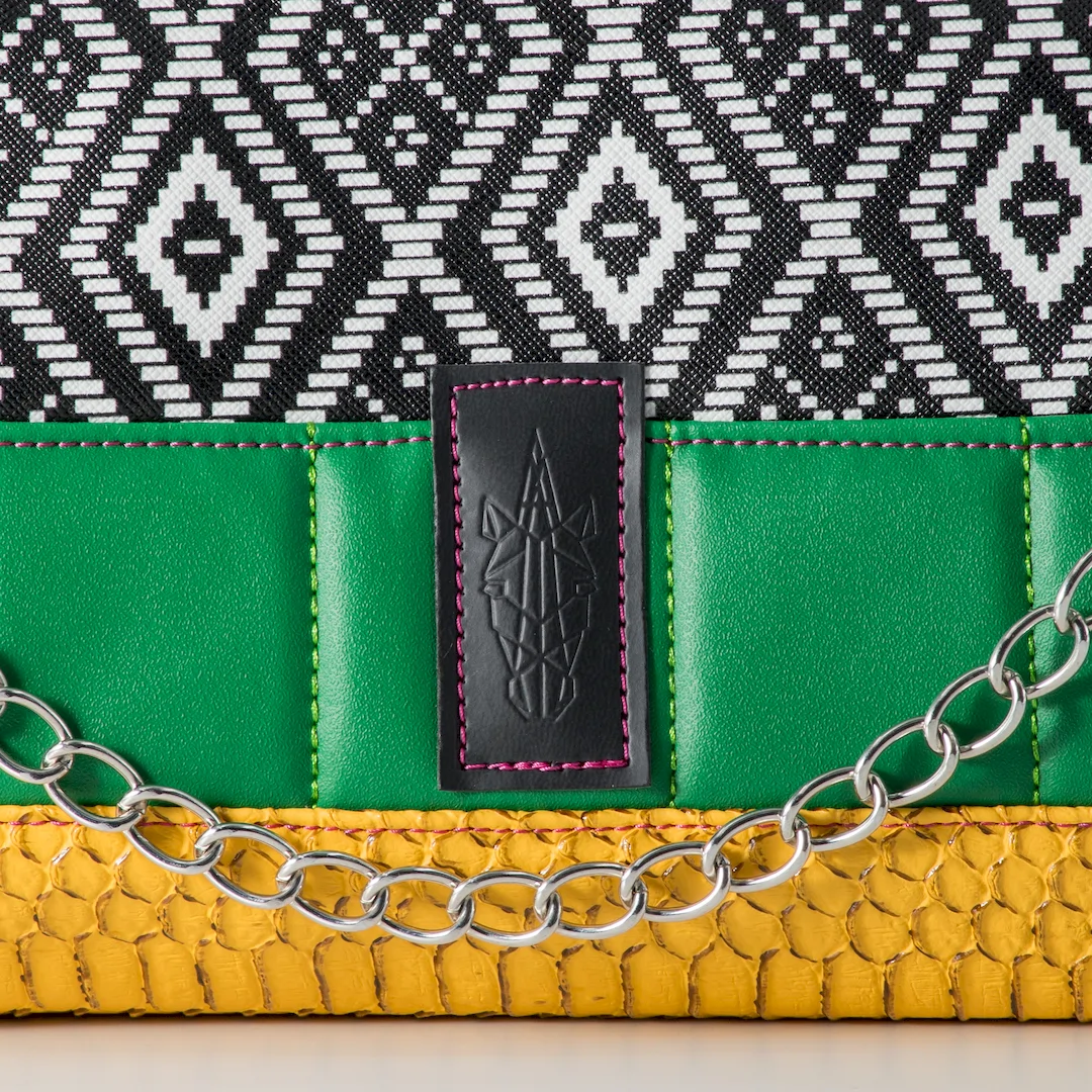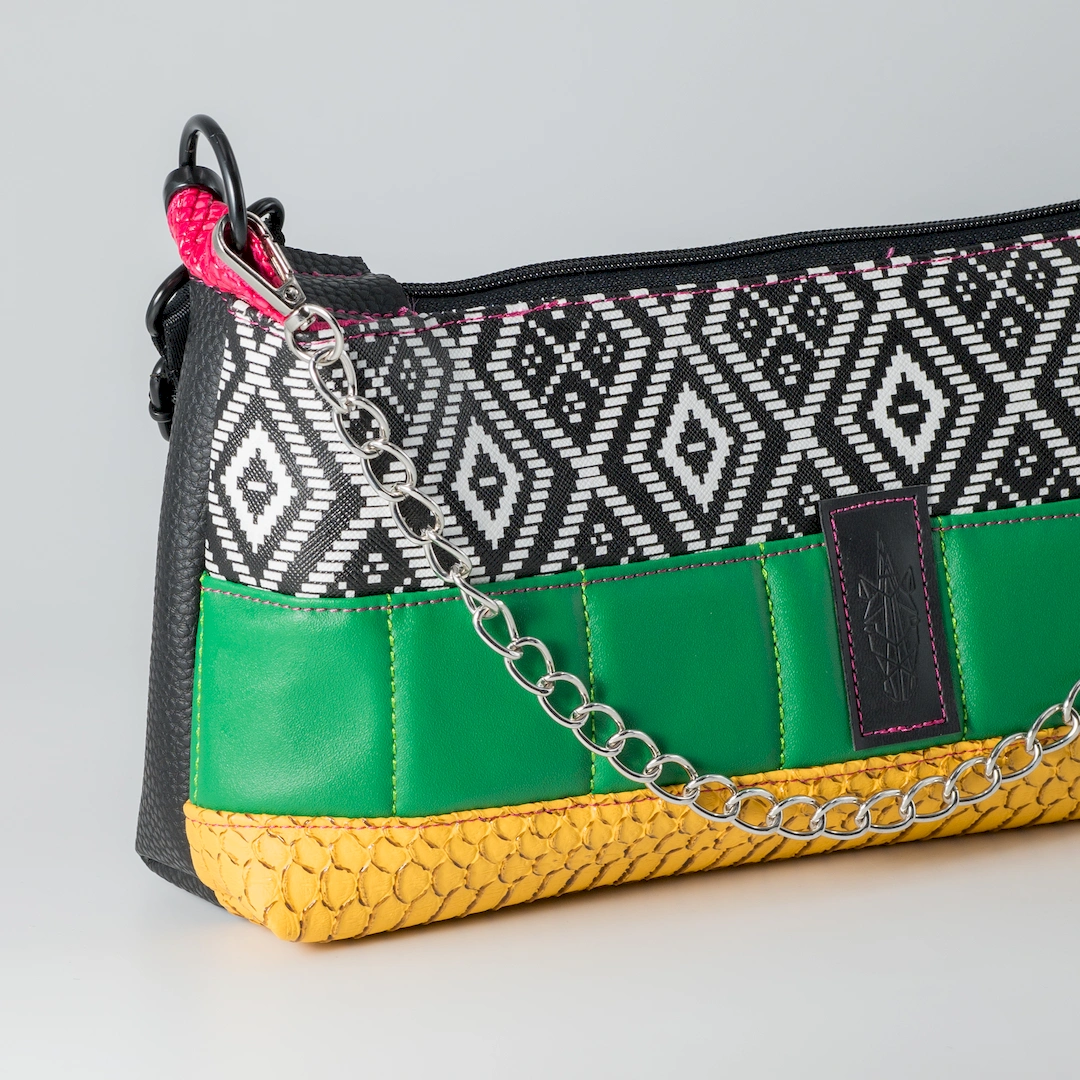 A shoulder bag crafted from 4 materials: laminated faux leather with a black and white pattern, quilted matte green faux leather, magenta and yellow faux leather with an embossed snake effect, and matte black faux leather. The Jungle Small Baguette Bag features two internal pockets, fuchsia lining, and a zipper closure. It has a black strap, 4 cm wide, which is adjustable and detachable, and the bag can be worn both crossbody and on the shoulder. It also has a 0.4 cm long chain that is suitable for wearing on the shoulder but can also be used for decorative purposes. The small baguette bag is 14 cm high, 35 cm long, with a 9 cm base. width. All our products are manufactured in our atelier in Thessaloniki, one by one with respect for both the customer and the environment, and are Greek-made. You can find more designs in the https://katiangeli.com/baguette-bags/small-baguette-bags/ category.