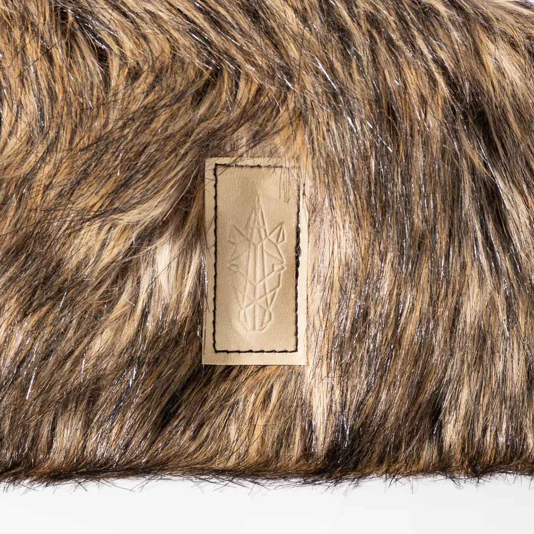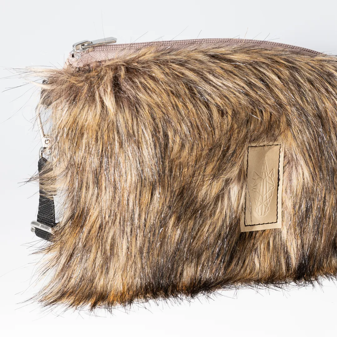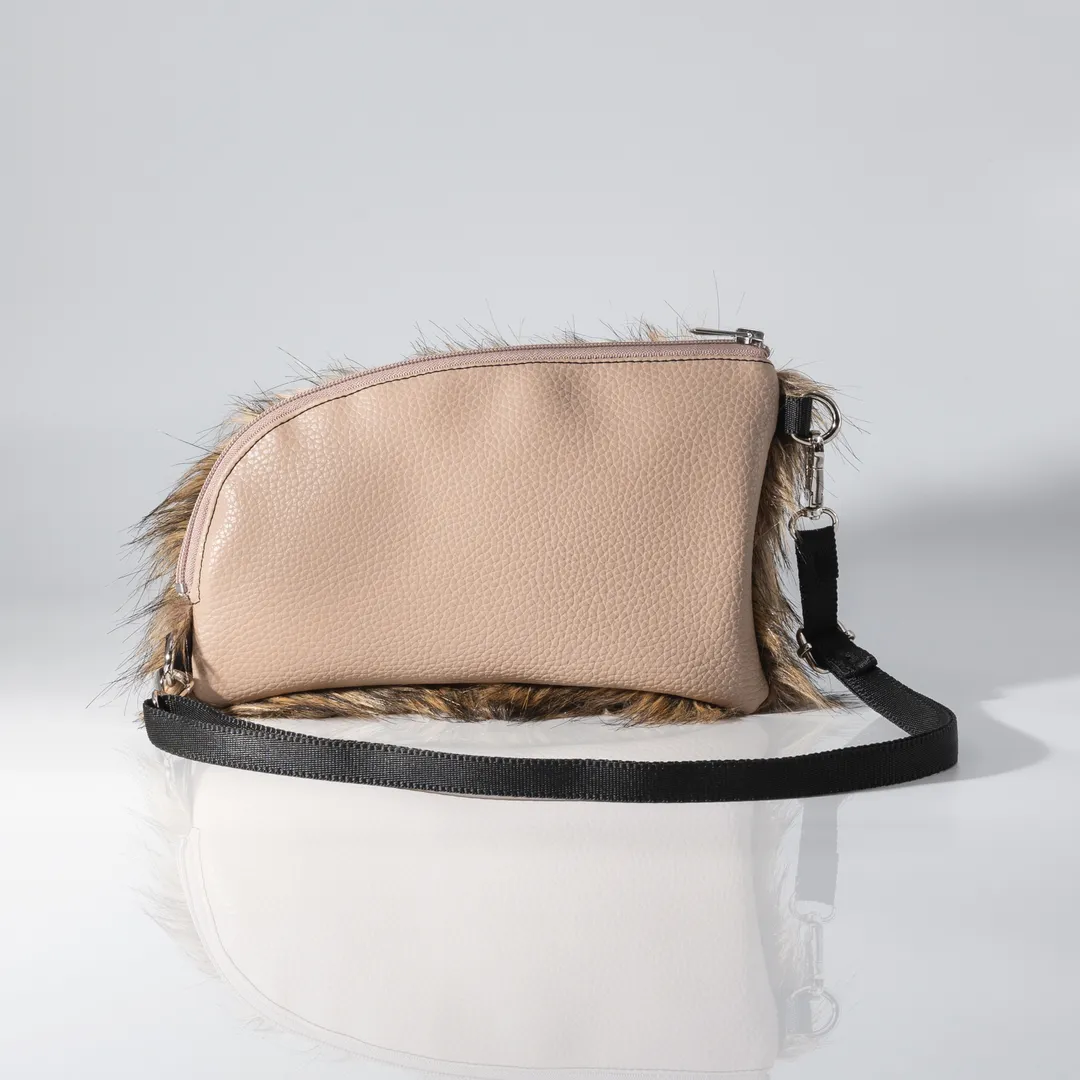 Pouch made from beige and brown faux fur with matte beige leatherette. It closes with a zipper and has a beige lining inside. The Lion King Pouch is designed to be worn crossbody with its strap. It features a 1.5 cm wide strap that’s adjustable and detachable. It measures 26 cm long and 16 cm high, comfortably fitting your phone, keys, tobacco pouch or iqos, and a small wallet. All our products are made in our Thessaloniki atelier, with a focus on detail and respect for our customers and the environment.