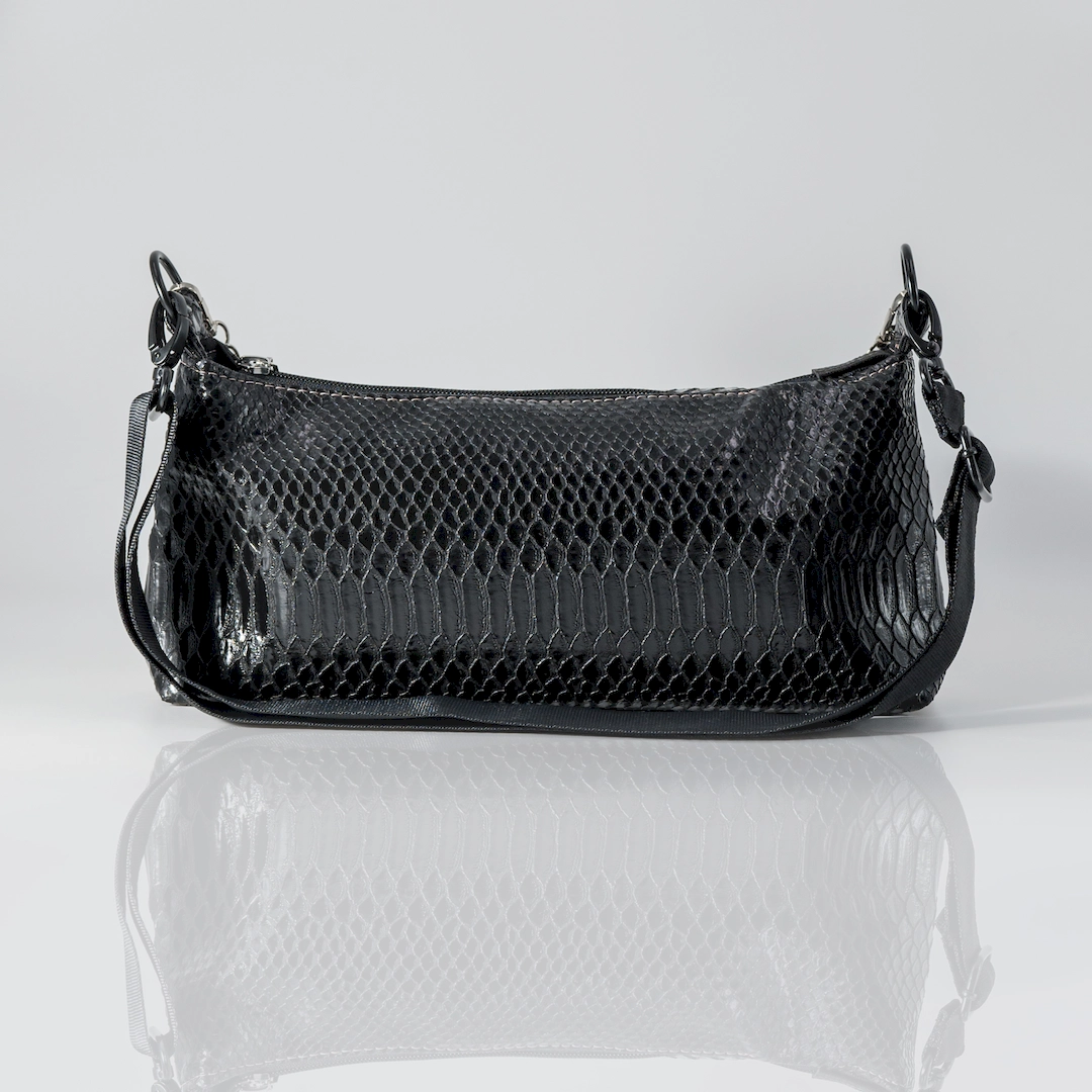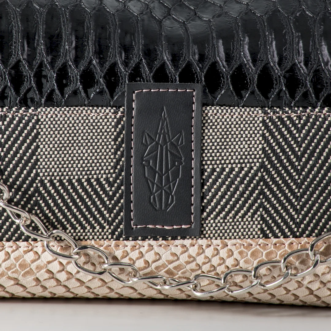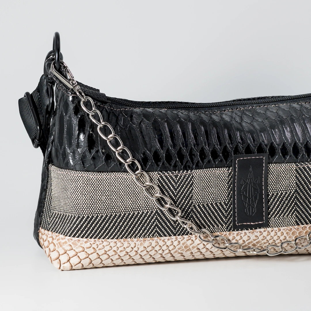 A shoulder bag crafted from 3 materials: ecru and black faux leather with an embossed snake effect, and a sturdy synthetic material with a straw effect. The Māori Small Baguette Bag features two internal pockets, a black lining, and a zipper closure. It has a black strap, 4 cm wide, which is adjustable and detachable, and the bag can be worn both crossbody and on the shoulder. It also has a 0.4 cm long chain that is suitable for wearing on the shoulder but can also be used for decorative purposes. The small baguette bag is 14 cm high, 35 cm long, with a 9 cm base. width. All our products are manufactured in our atelier in Thessaloniki, one by one with respect for both the customer and the environment, and are Greek-made. You can find more designs in the https://katiangeli.com/baguette-bags/small-baguette-bags/ category.