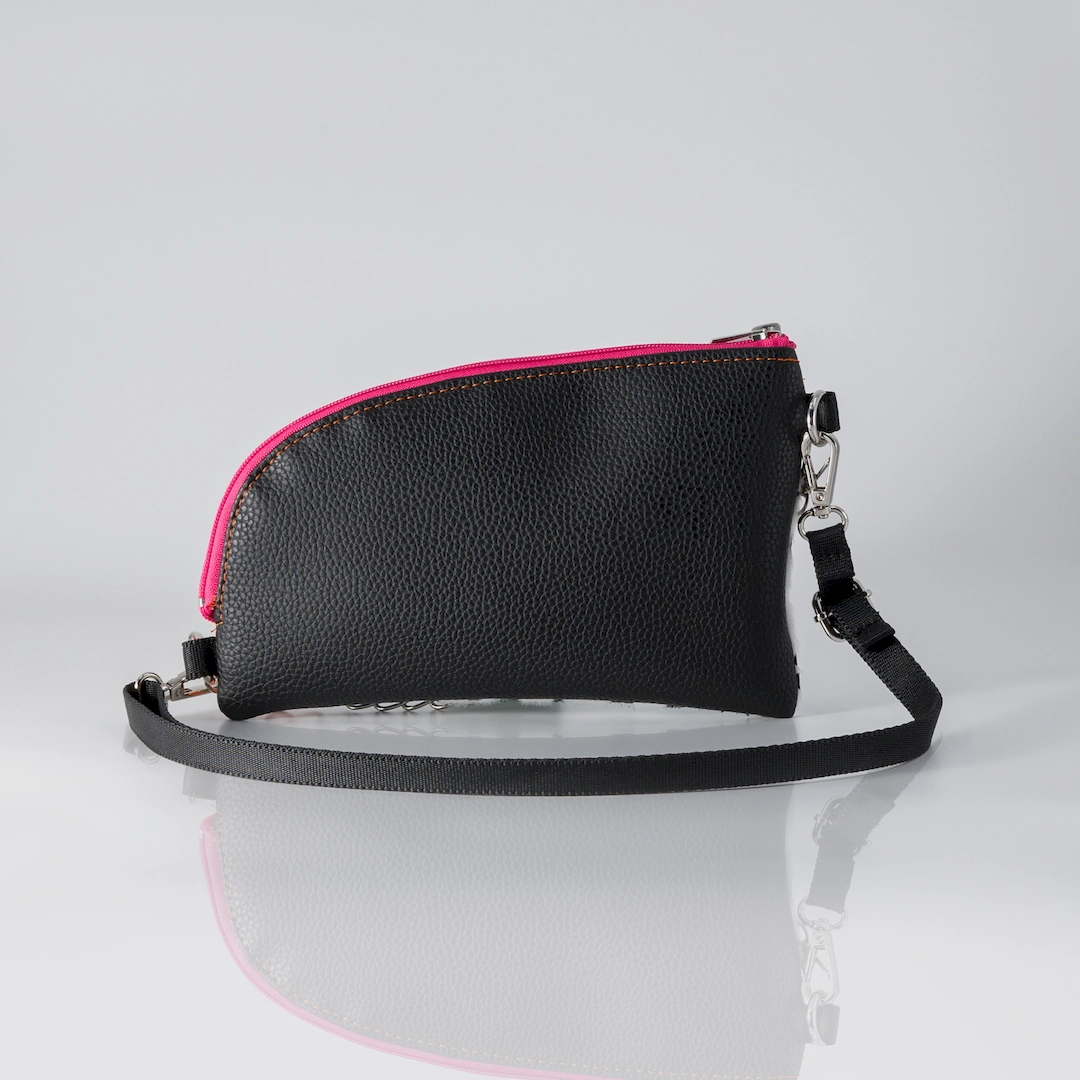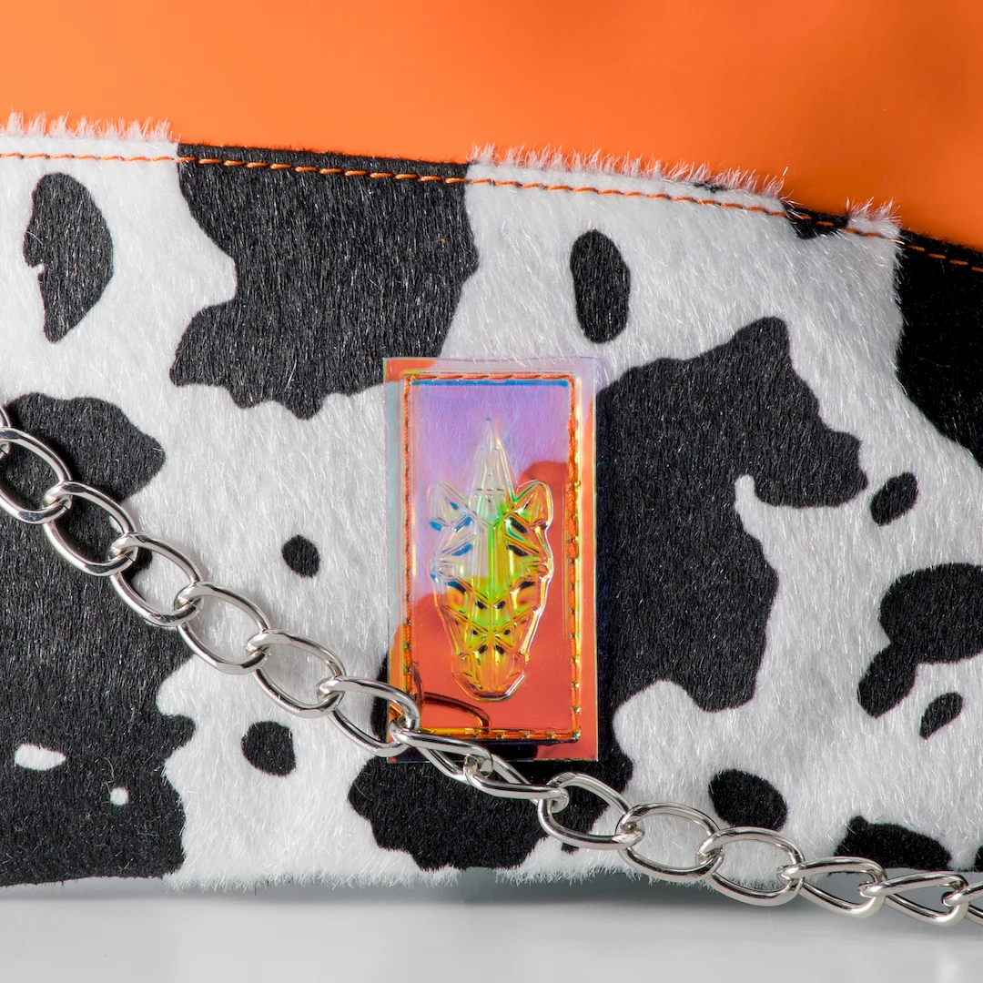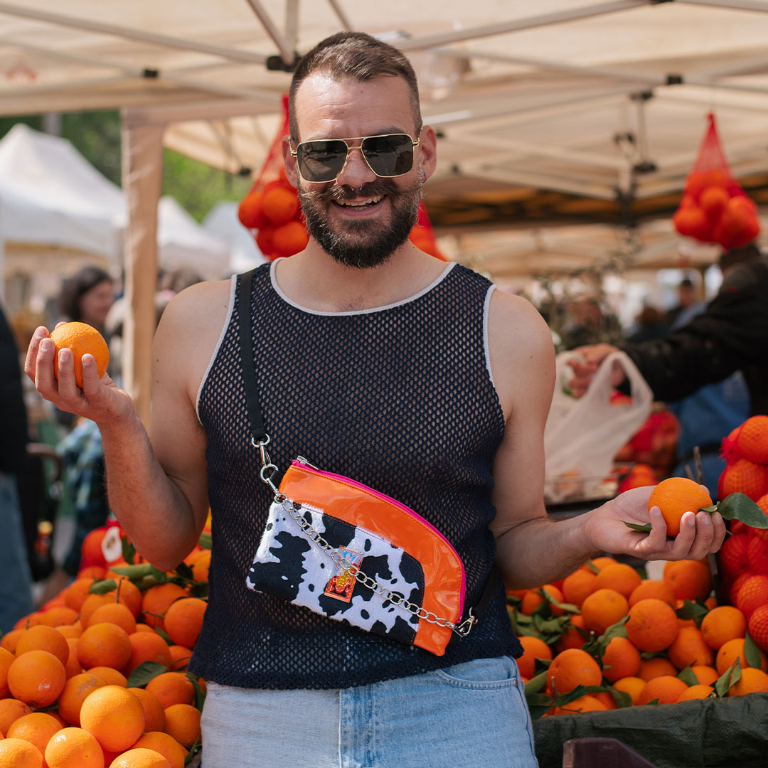 A pouch crafted from orange patent faux leather, synthetic pony-effect material with black and white cow print, and black matte faux leather. It closes with a zipper and has a fuchsia lining on the inside. The Orange Cow Pouch is designed to be worn crossbody with its strap, but it can also be carried as a clutch, as the strap is removable and its decorative chain can be used as a handle. It features a black 1.5 cm wide strap. It features an adjustable and detachable strap, plus a removable chain. It measures 26 cm long by 16 cm high, comfortably fitting your phone, keys, tobacco pouch or IQOS, and a small wallet. All our products are made in our Thessaloniki atelier, with a focus on detail and respect for our customers and the environment. You can find other designs in the https://katiangeli.com/pouches/ category.