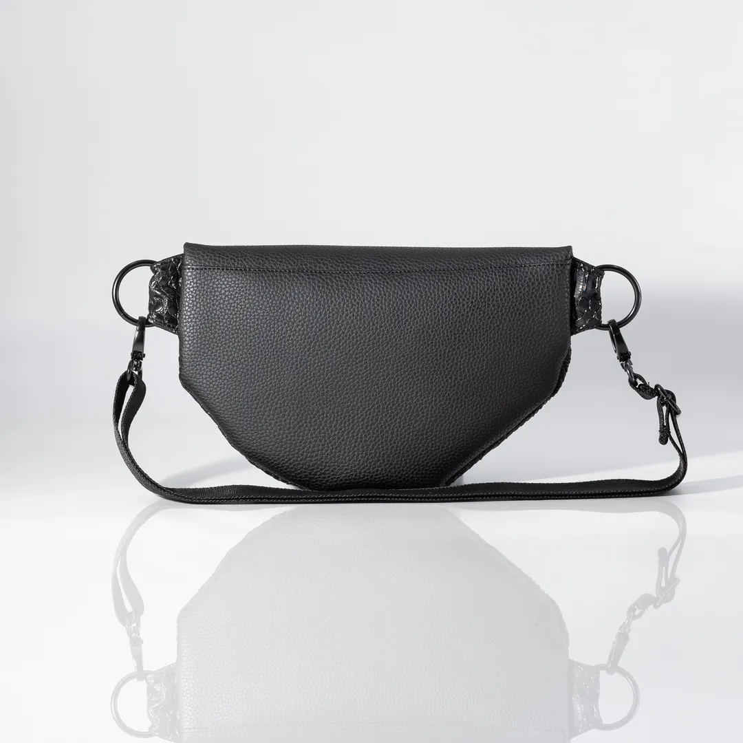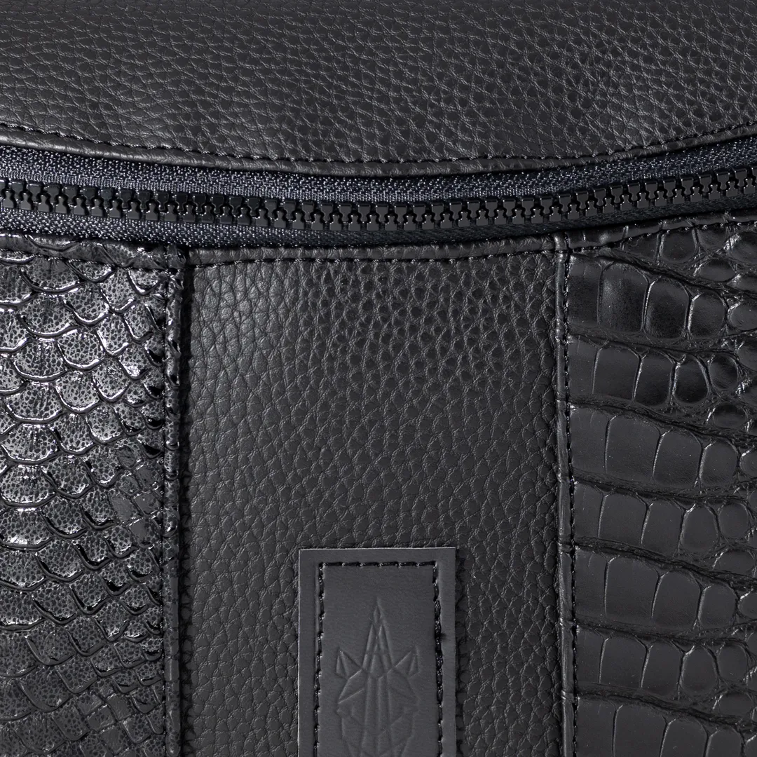 Banana bag made of 3 materials: matte black leatherette, black leatherette with embossed croco effect and black leatherette with embossed snake effect. The Panther Small Banana Bag has two pockets inside and a black lining. It has a black strap, 4 cm wide, which is adjustable and detachable. Small size: 32 cm. 20 cm zipper. height. All our products are handmade in our Thessaloniki atelier, with attention to detail and respect for our customers and the environment.