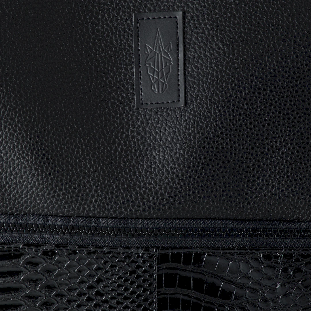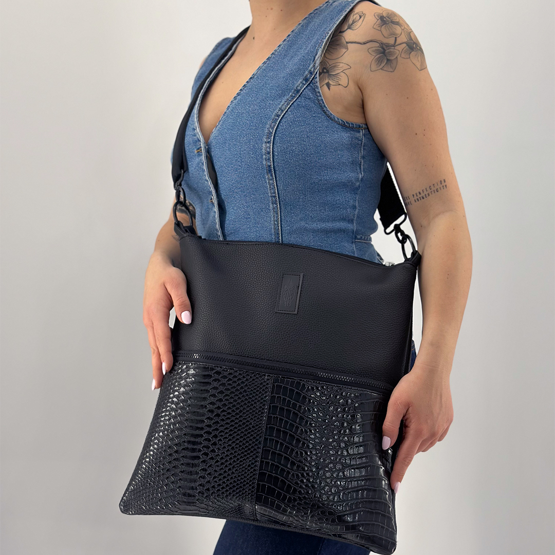 A tote bag crafted from 3 materials: matte black faux leather, matte faux leather with an embossed crocodile effect, and black faux leather with an embossed snake effect. The Panther Tote Bag features two internal pockets, black lining, and a zippered main compartment. It also has an exterior zippered pocket. It is available with a 4cm wide black strap that is adjustable and detachable. This bag is spacious and perfect for all-day use. Wear it on your shoulder or crossbody. Οι διαστάσεις της είναι στα 39 εκ. ύψος με 32 εκ. μήκος. All our products are handmade in our Thessaloniki atelier, with attention to detail and respect for our customers and the environment. In the category https://katiangeli.com/large-bags/tote-bags/where you can find other designs.