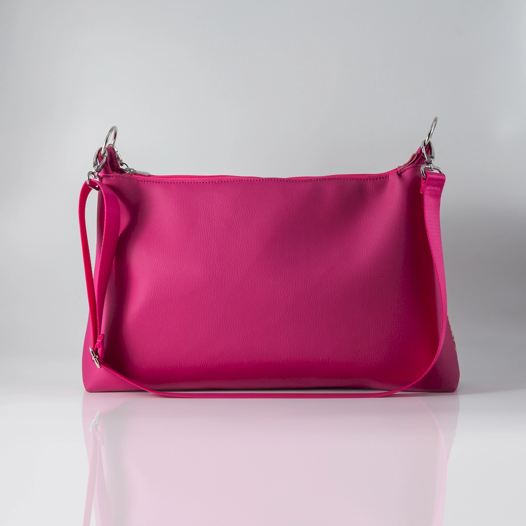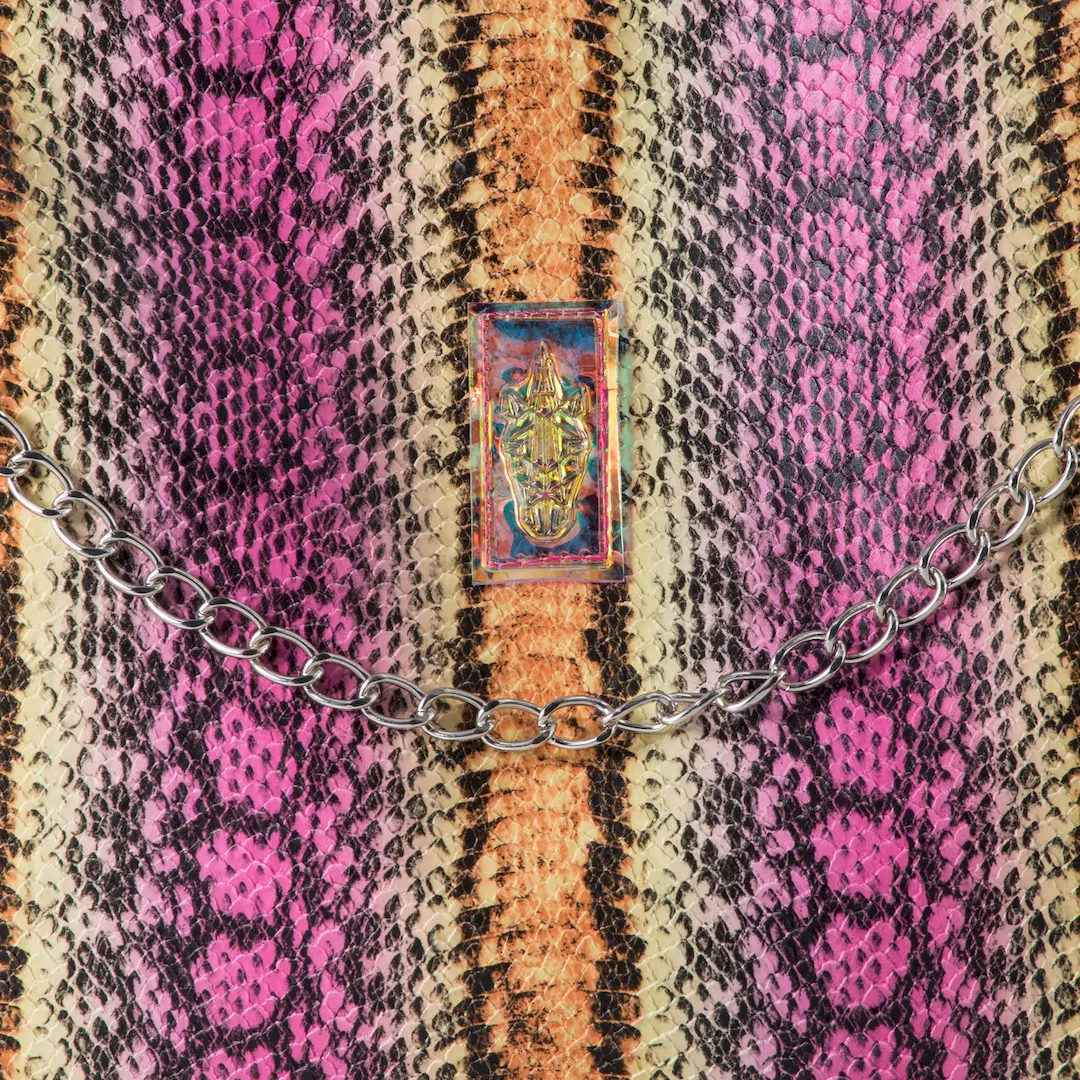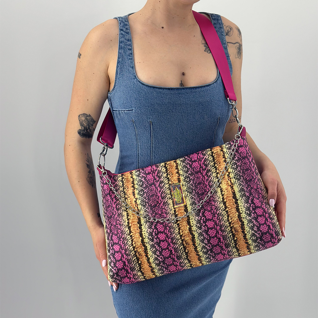 Τσάντα κατασκευασμένη από 2 υλικά:πολύχρωμη δερματίνη με ανάγλυφο εφέ φιδιού και ματ δερματίνη σε magenta χρώμα. Η Rainbow Mamba Medium Baguette Bag έχει δύο τσέπες, φούξια φόδρα και κλείνει με φερμουάρ. It has a fuchsia strap, 4 cm wide. which is adjustable and detachable, and the bag can be worn both crossbody and on the shoulder. It also has a 0.5 cm long chain that is suitable for wearing on the shoulder but also has decorative use. The medium baguette bag measures 26 cm in height, 40 cm length, and 10 cm width at the base. All our products are handmade in our Thessaloniki atelier, with attention to detail and respect for our customers and the environment. In the category https://katiangeli.com/baguette-bags/medium-baguette-bags/ you can find other designs.