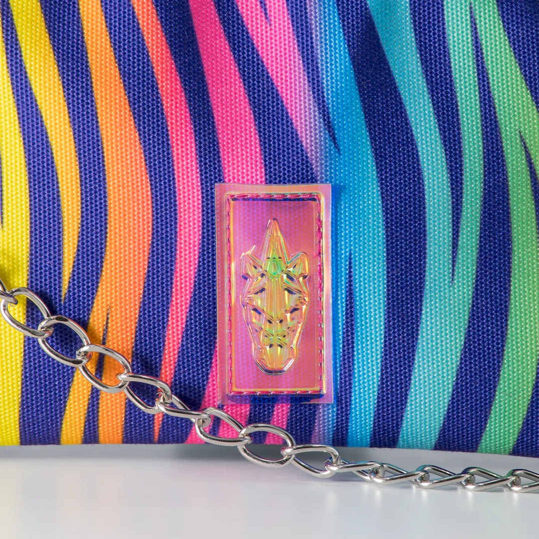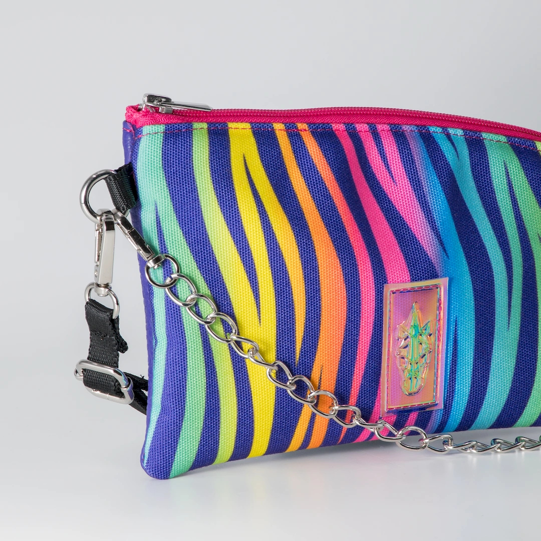 A pouch crafted from canvas-type fabric, suitable for bags, featuring a colorful zebra print and matte purple faux leather. It closes with a zipper and has a fuchsia lining on the inside. The Rainbow Zebra Pouch is designed to be worn crossbody with its strap, but it can also be carried as a clutch since the strap is removable, allowing its decorative chain to be used as a handle. It features a black 1.5 cm wide strap. It features an adjustable and detachable strap, plus a removable chain. It measures 26 cm long by 16 cm high, comfortably fitting your phone, keys, tobacco pouch or IQOS, and a small wallet. All our products are made in our Thessaloniki atelier, with a focus on detail and respect for our customers and the environment. You can find other designs in the https://katiangeli.com/pouches/ category.