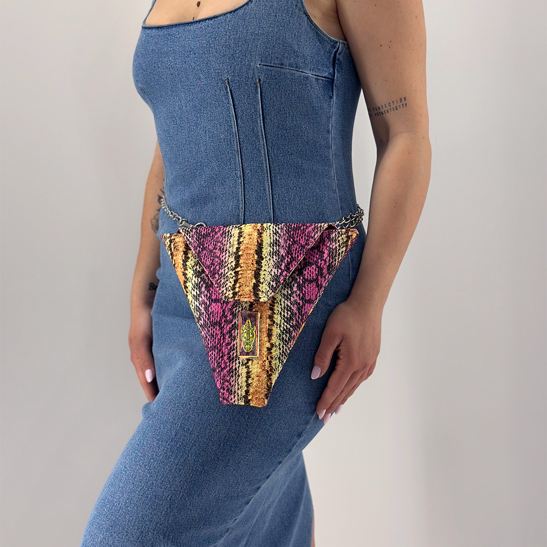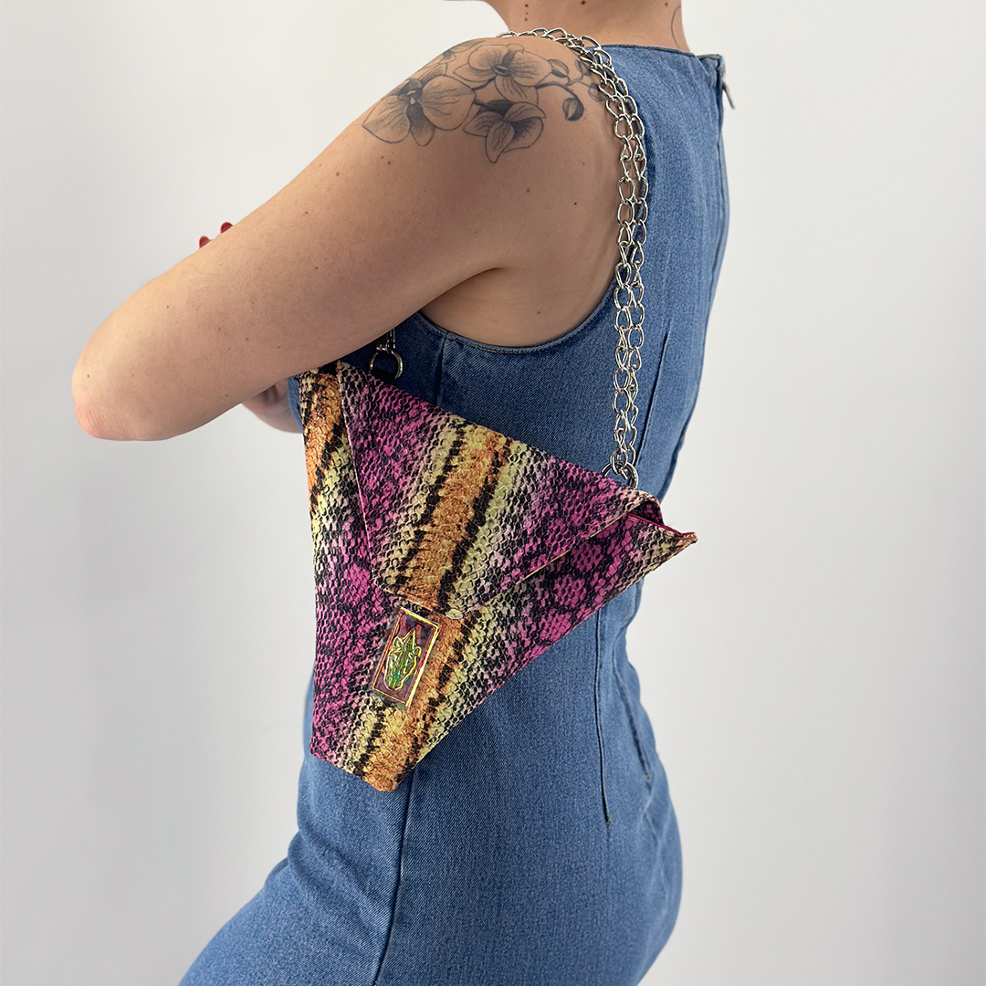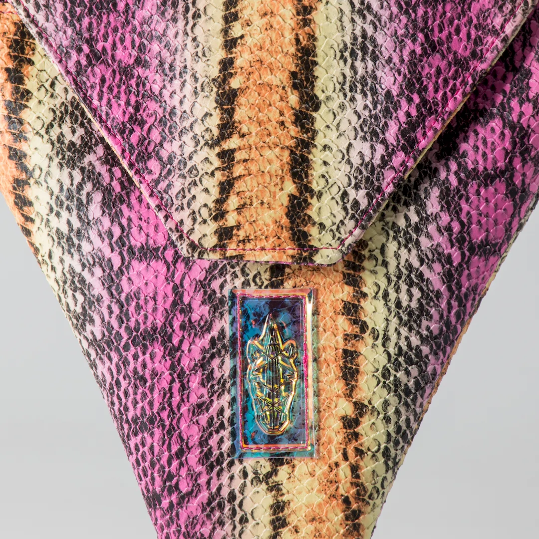 Τσάντα σε τριγωνικό σχήμα από πολύχρωμη δερματίνη με ανάγλυφο εφέ φιδιού. Κλείνει με μεταλλικό κούμπωμα και εσωτερικά έχει φούξια φόδρα. Η Rainbow mamba Crêpe Bag διαθέτει μεταλλική αλυσίδα σε χρώμα νίκελ, μήκους 1,10 m. και είναι αποσπώμενη. Μπορεί να φορεθεί με 3 τρόπους: χιαστί, στον ώμο (αν η αλυσίδα περαστεί διπλή) και στη μέση ως ζώνη (αν το 2ο κλιπ προσαρμοστεί πάνω στην αλυσίδα). Έχουν 25 εκ. ύψος με 26 εκ. άνοιγμα στο καπάκι. Χωράνε με άνεση κινητό, κλειδιά, συσκευή iqos ή θήκη καπνού. Όλα μας τα προϊόντα κατασκευάζονται στο ατελιέ μας στη Θεσσαλονίκη, με έμφαση στη λεπτομέρεια και σεβασμό στον πελάτη και στο περιβάλλον.