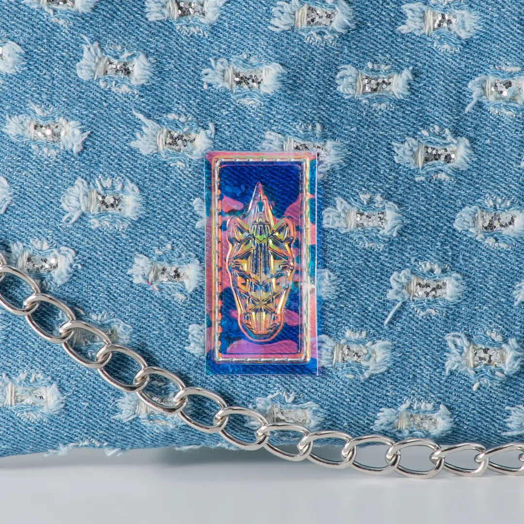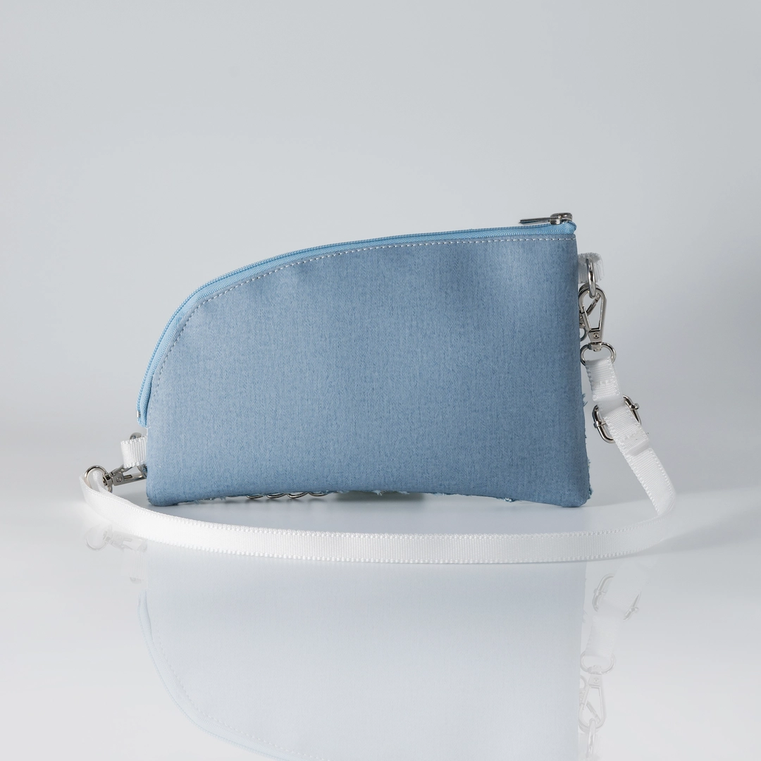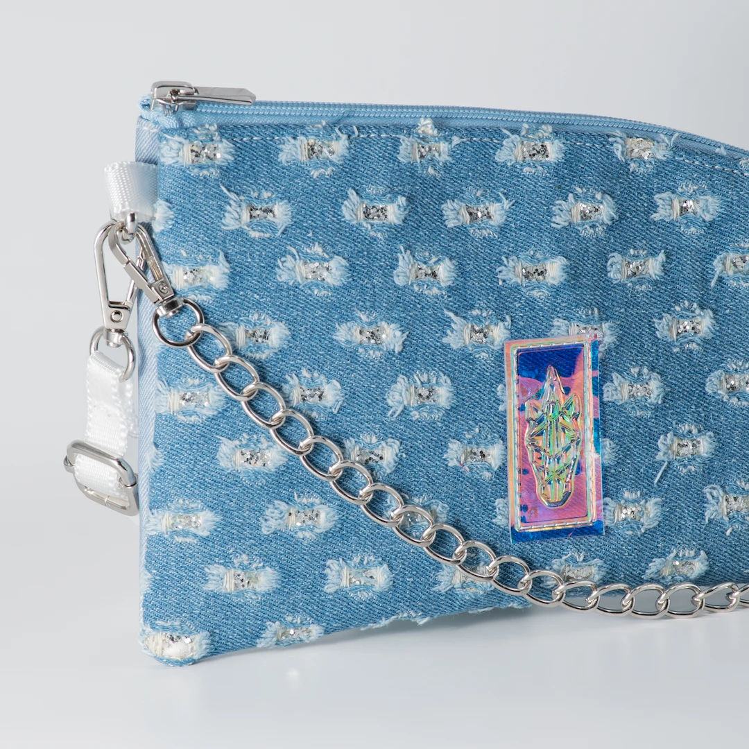 Φάκελος κατασκευασμένος από τζιν σταθερό με ασημί λεπτομέρειες γκλίτερ (κατάλληλο για την κατασκευή τσαντών) και δερματίνη ματ με εφέ τζιν σε γαλάζιο χρώμα. Κλείνει με φερμουάρ και εσωτερικά έχει φούξια φόδρα. Το Sparkling Jeans Pouch είναι κατασκευασμένο για να φοριέται χιαστί με τον ιμάντα του, αλλά μπορεί να κρατηθεί και ως φάκελος σκέτος αφού ο ιμάντας μπορεί να αφαιρεθεί και να χρησιμοποιηθεί η διακοσμητική του αλυσίδα ως λαβή. Διαθέτει λευκό ιμάντα φάρδους 1,5 εκ. με αυξομείωση και αλυσίδα, που και τα δύο είναι αποσπώμενα. Έχει 26 εκ. μήκος με 16 εκ. ύψος και χωράει με άνεση κινητό, κλειδιά, καπνοθήκη ή iqos και ένα μικρό πορτοφόλι. Όλα μας τα προϊόντα κατασκευάζονται στο ατελιέ μας στη Θεσσαλονίκη, με έμφαση στη λεπτομέρεια και σεβασμό στον πελάτη και στο περιβάλλον.
